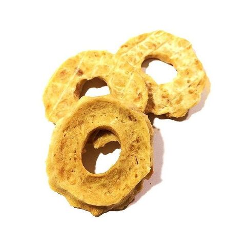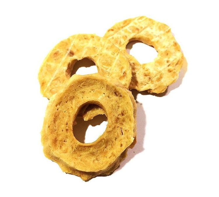 原料はささみだけのドーナツ型チップ。ドーナツ型にすることで割りやすくて食べやすくなったささみチップスです。