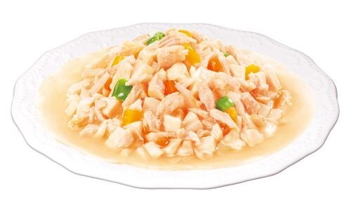 14歳からの愛犬のために。低脂肪なささみをふっくら蒸して、低カロリー※に仕上げました。厳選されたささみに彩り野菜を加えて、丁寧に調理し、素材のおいしさをそのまま閉じ込めました。高齢犬にも食べやすく、ささみを細かくほぐしています。グルコサミン配合で、足腰の健康維持をサポート。