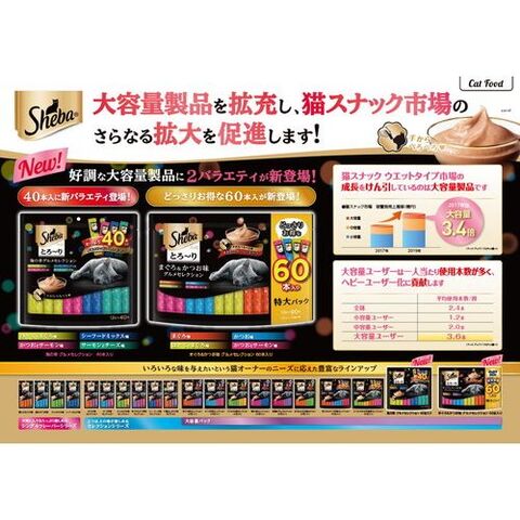 猫ちゃんが手からでも舐めやすい、贅沢なおいしさの“とろ~り”おやつ。人気の4種をたっぷり入れたセレクションの大容量タイプ。