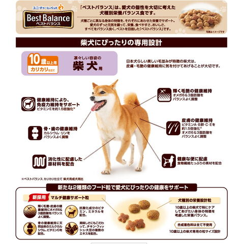 ・皮膚の健康維持のために、ビタミンA、B群、C、Eを約1.5倍強化*(*ベストバランスカリカリ仕立て柴犬用成犬用比)