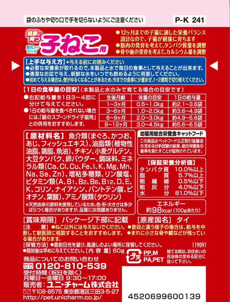 ユニチャーム 銀のスプーン パウチ 健康に育つ子ねこ用 まぐろ・かつお 60g【ポイント10倍】