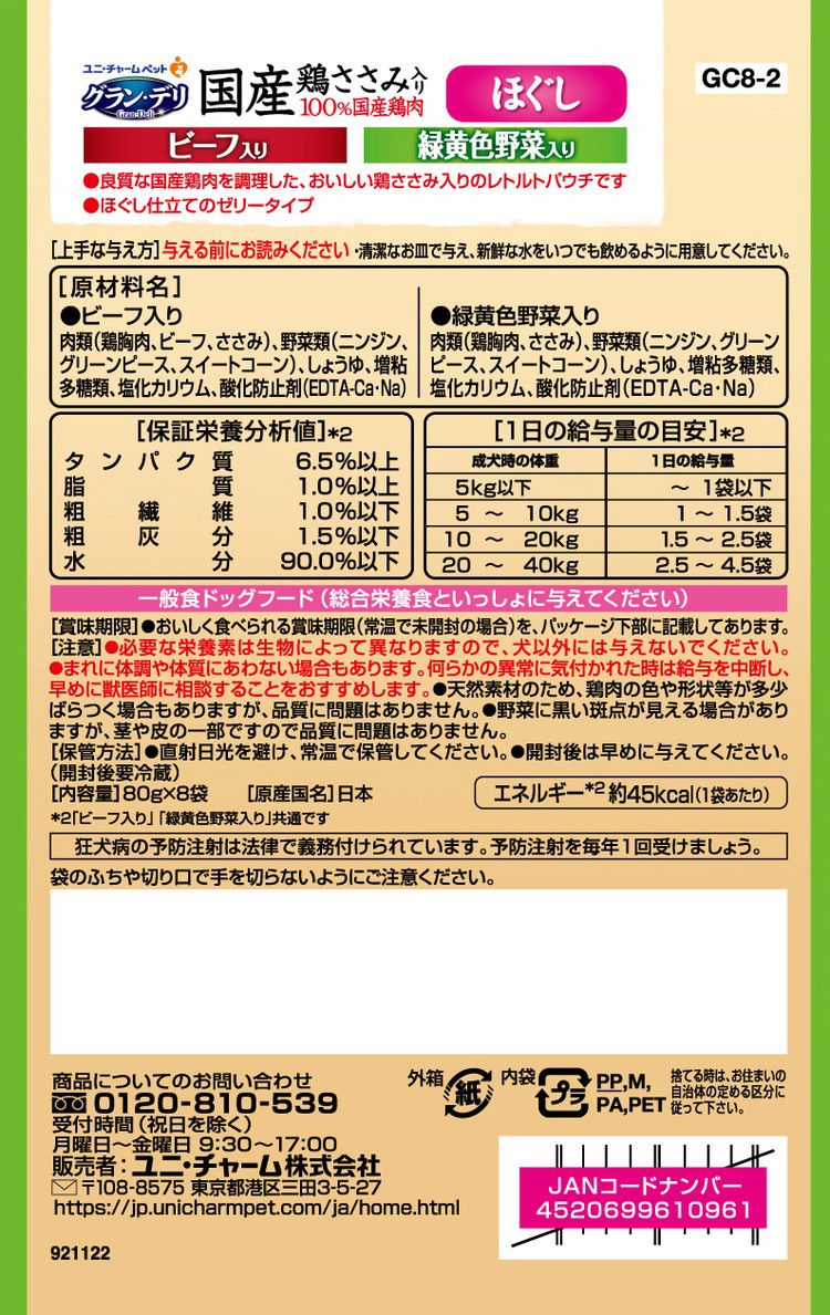 ユニチャーム グラン・デリ 国産鶏ささみパウチ ほぐし 成犬用8袋パック ビーフ入り&緑黄色野菜入り 80g×8袋【ポイント10倍】