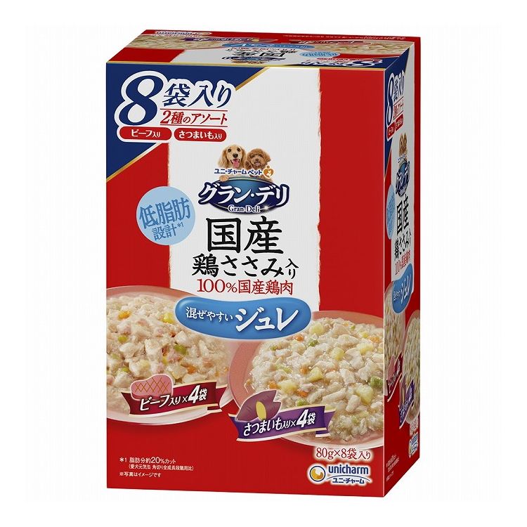 ユニチャーム グラン・デリ 国産鶏ささみパウチ ジュレ 成犬用8袋パック ビーフ入り&さつまいも入り 80g×8袋【ポイント10倍】