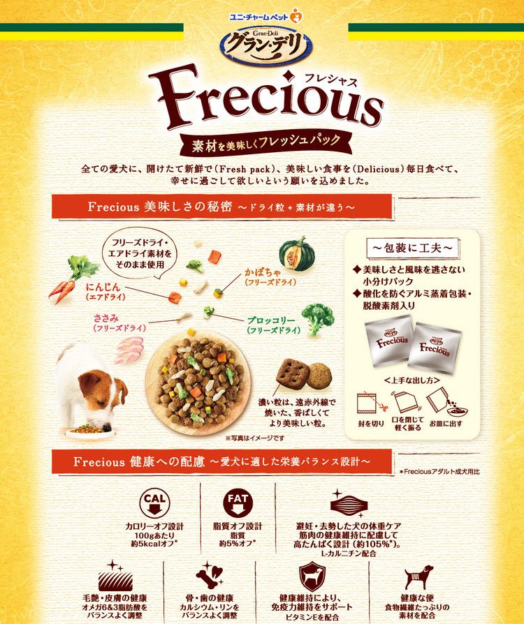 100gあたり約5kcalオフ* ※フレシャス アダルト成犬用比