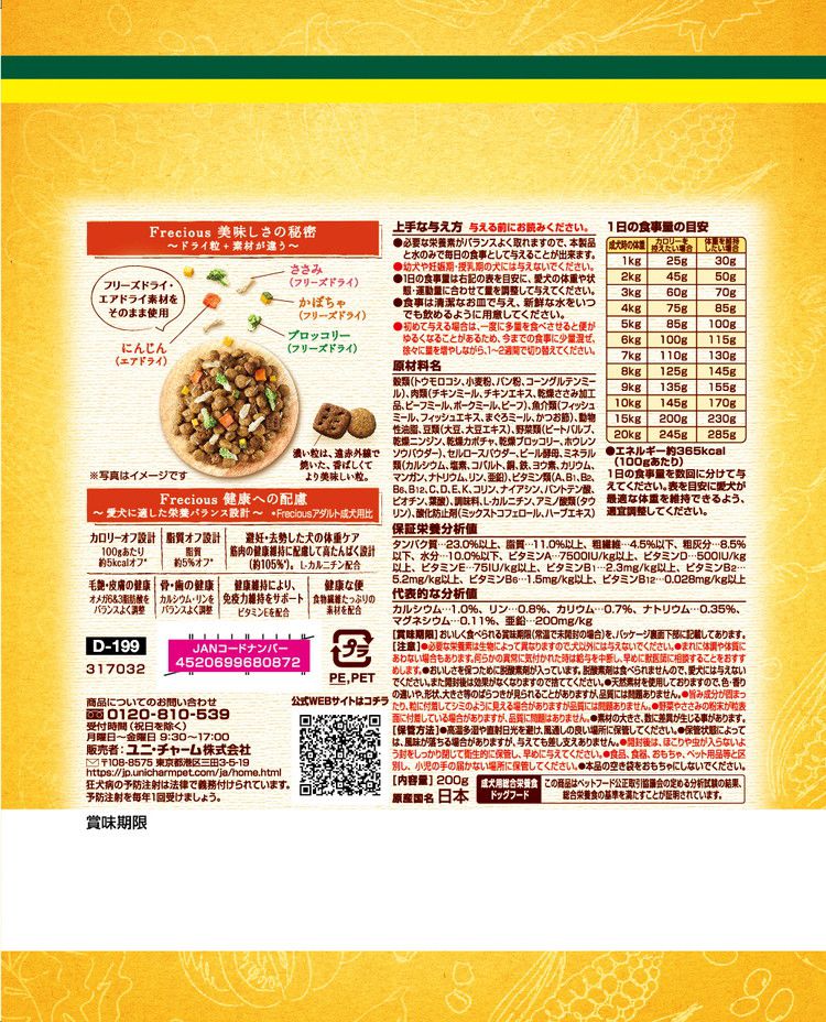 穀類(トウモロコシ、小麦粉、パン粉、コーングルテンミール)、肉類(チキンミール、チキンエキス、乾燥ささみ加工品、ビーフミール、ポークミール、ビーフ)、魚介類(フィッシュミール、フィッシュエキス、まぐろミール、かつお節)、動物性油脂、豆類(大豆、大豆エキス)、野菜類(ビートパルプ、乾燥ニンジン、乾燥カボチャ、乾燥ブロッコリー、ホウレンソウパウダー)、セルロースパウダー、ビール酵母、ミネラル類(カルシウム、塩素、コバルト、銅、鉄、ヨウ素、カリウム、マンガン、ナトリウム、リン、亜鉛)、ビタミン類(A、B1、B2、B6、B12、C、D、E、K、コリン、ナイアシン、パントテン酸、ビオチン、葉酸)、調味料、L-カルニチン、アミノ酸類(タウリン)、酸化防止剤(ミックストコフェロール、ハーブエキス)