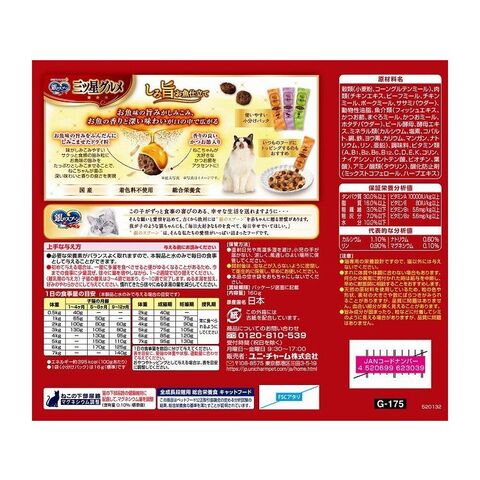 穀類(小麦粉、コーングルテンミール)、肉類(チキンエキス、ビーフミール、チキンミール、ポークミール、ササミパウダー)、動物性油脂、魚介類(フィッシュエキス、かつお節、まぐろミール、かつおミール、ホタテパウダー)、ビール酵母、酵母エキス、ミネラル類(カルシウム、塩素、コバルト、銅、鉄、ヨウ素、カリウム、マンガン、ナトリウム、リン、亜鉛)、調味料、ビタミン類(A、B1、B2、B6、B12、C、D、E、K、コリン、ナイアシン、パントテン酸、ビオチン、葉酸)、アミノ酸類(タウリン)、酸化防止剤(ミックストコフェロール、ハーブエキス)