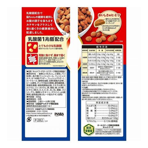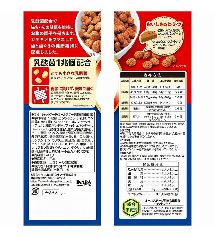 穀類(とうもろこし、小麦粉、パン粉等)、魚介類(フィッシュミール、フィッシュエキス、かつお節パウダー、フィッシュパウダー)、ミートミール、動物性油脂、豆類(脱脂大豆等)、ビール酵母、タンパク加水分解物、酵母細胞壁、殺菌乳酸菌、植物発酵抽出物、ミネラル類(カルシウム、リン、カリウム、鉄、亜鉛、銅、ヨウ素)、ビタミン類(A、D、E、K、B1、B2、B6、葉酸、コリン)、アミノ酸類(メチオニン、タウリン)、pH調整剤、緑茶抽出物(ガレート型カテキン含有)