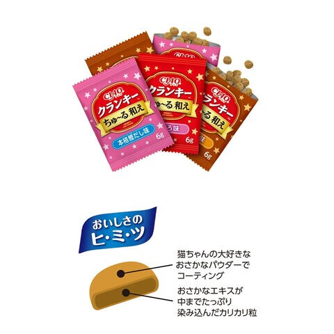 ・おいしさのヒミツは、「ちゅ~る」が中までを染み込んだカリカリ粒に猫ちゃんの大好きなおさかなパウダーやチキンパウダーで粒をコーティング♪