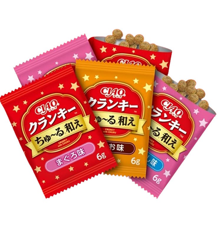 ・「ちゅ~る まぐろ」が中まで染み込んだカリカリ粒におさかなパウダーで粒をコーティングした美味しいおやつです。