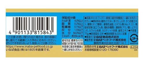 鶏肉(ささみ)、まぐろ、しらす、かつお節エキス、糖類(オリゴ糖等)、植物性油脂、ミネラル類(Na、P、Cl)、増粘安定剤(加工でん粉、増粘多糖類)、調味料(アミノ酸)、ビタミンE、カラメル色素、カロテノイド色素、緑茶エキス