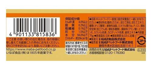 鶏肉(ささみ)、ほたて貝柱、ほたてエキス、糖類(オリゴ糖等)、植物性油脂、ミネラル類(Na、P、Cl)、増粘安定剤(加工でん粉、増粘多糖類)、調味料(アミノ酸)、ビタミンE、カラメル色素、カロテノイド色素、緑茶エキス