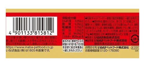 鶏肉(ささみ)、まぐろ、かつお節エキス、糖類(オリゴ糖等)、植物性油脂、ミネラル類(Na、P、Cl)、増粘安定剤(加工でん粉、増粘多糖類)、調味料(アミノ酸)、ビタミンE、カラメル色素、カロテノイド色素、緑茶エキス