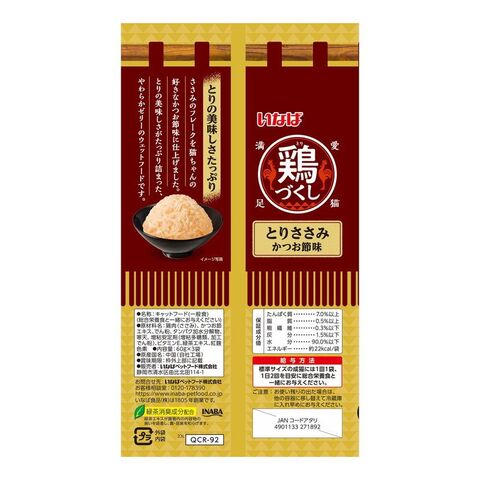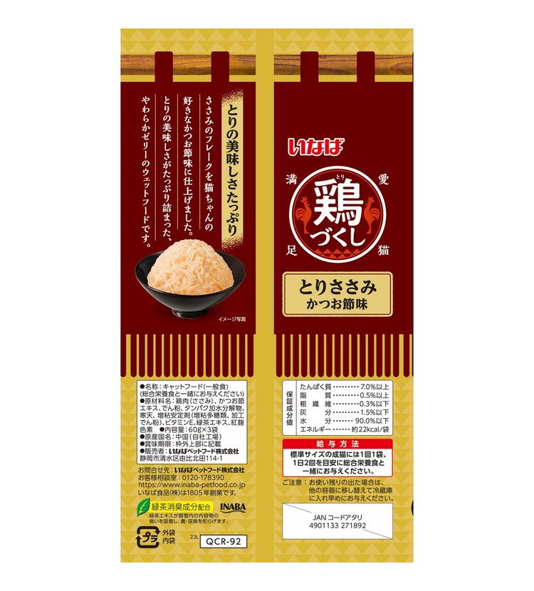 鶏肉(ささみ)、かつお節エキス、でん粉、タンパク加水分解物、寒天、増粘安定剤(増粘多糖類、加工でん粉)、ビタミンE、緑茶エキス