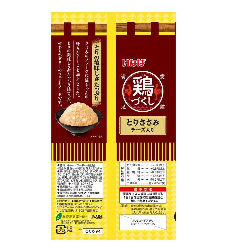 鶏肉(ささみ)、チーズ、チキンエキス、でん粉、タンパク加水分解物、寒天、増粘安定剤(増粘多糖類、加工でん粉)、ビタミンE、緑茶エキス