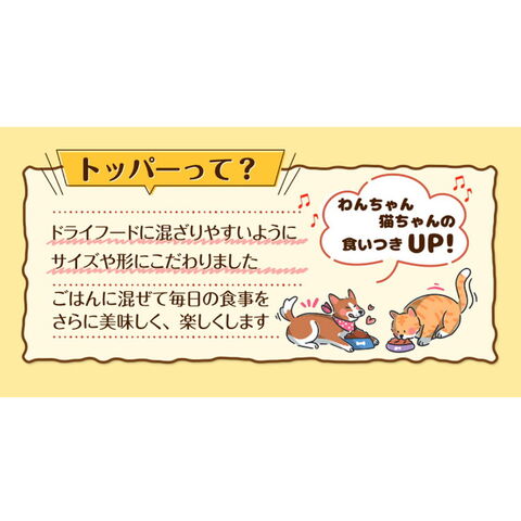 ・おやつとしてそのまま与えても、ドライフードに混ぜてトッピングとしてもお使いいただけます。