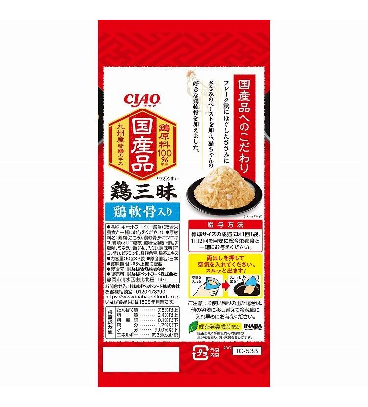 鶏肉(ささみ)、鶏軟骨、チキンエキス、糖類(オリゴ糖等)、植物性油脂、増粘多糖類、ミネラル類(Na、P、Cl)、調味料(アミノ酸)、ビタミンE、紅麹色素、緑茶エキス