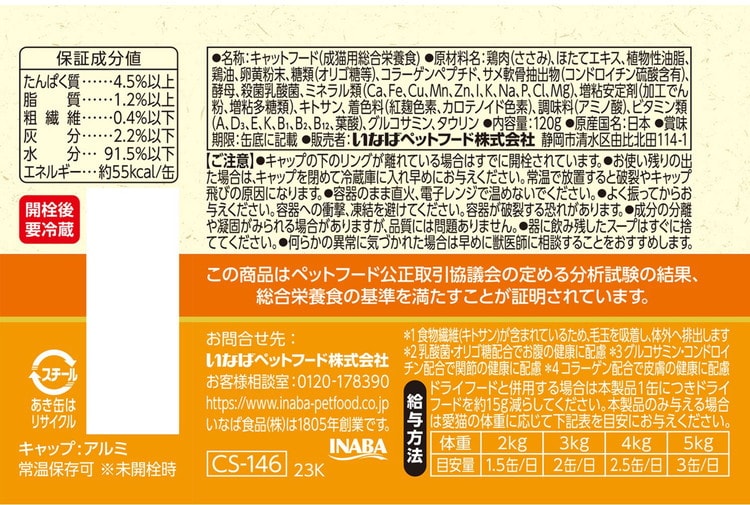 鶏肉(ささみ)、ほたてエキス、植物性油脂、鶏油、卵黄粉末、糖類(オリゴ糖等)、コラーゲンペプチド、サメ軟骨抽出物(コンドロイチン硫酸含有)、酵母、殺菌乳酸菌、ミネラル類(Ca、Fe、Cu、Mn、Zn、I、K、Na、P、Cl、Mg)、増粘安定剤(加工でん粉、増粘多糖類)、キトサン、着色料(カロテノイド色素)、調味料(アミノ酸)、ビタミン類(A、D3、E、K、B1、B2、B12、葉酸)、グルコサミン、タウリン