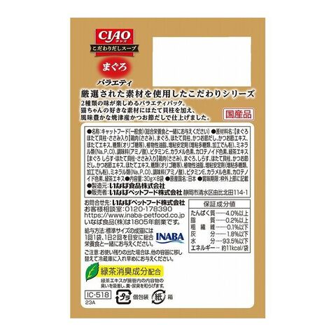 鶏肉(ささみ)、まぐろ、しらす、ほたて貝柱、かつお節だし、かつお節エキス、ほたてエキス、糖類(オリゴ糖等)、植物性油脂、増粘安定剤(増粘多糖類、加工でん粉)、ミネラル類(Na、P、Cl)、調味料(アミノ酸)、ビタミンE、カラメル色素、カロテノイド色素、緑茶エキス
