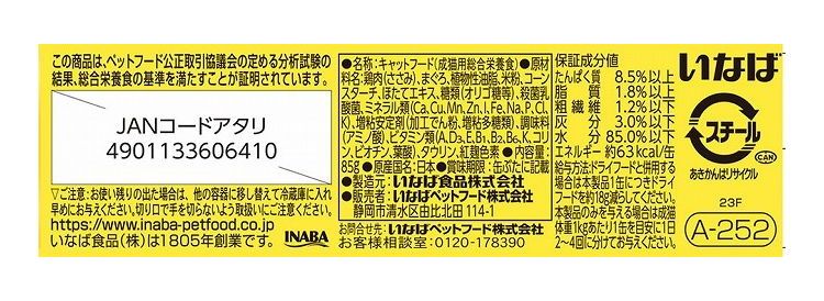 鶏肉(ささみ)、まぐろ、植物性油脂、米粉、コーンスターチ、ほたてエキス、糖類(オリゴ糖等)、殺菌乳酸菌、ミネラル類(Ca、Cu、Mn、Zn、l、Fe、Na、P、Cl、K)、セルロース、増粘安定剤(加工でん粉、増粘多糖類)、調味料(アミノ酸)、ビタミン類(A、D3、E、B1、B2、B6、K、コリン