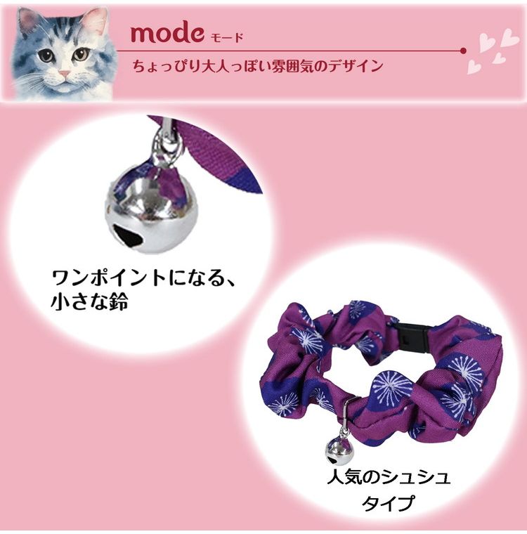 ル・コリエ メヌエットモードシリーズは上品でコケティッシュなデザイン。シュシュタイプでかわいらしい雰囲気ですが、シックな紫がネコちゃんのしなやかさを引き立てます。セーフティーバックルは枝などに引っ掛かっても外れやすくなっています。おしゃれだけじゃない、安全性も高いネコ首輪です。