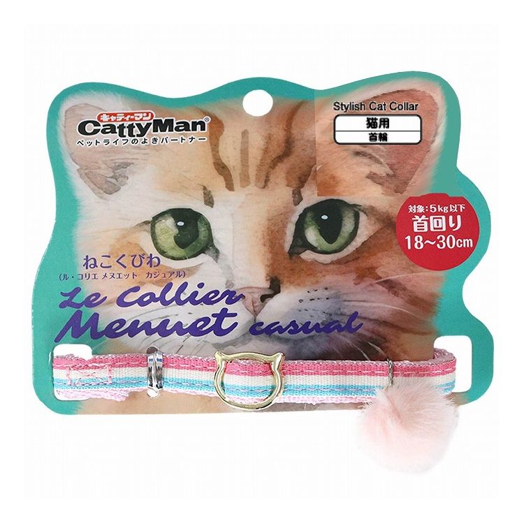 ル・コリエ メヌエットカジュアルシリーズはレトロ可愛いエッセンスを取り入れたポップ柄。ピンク・白・ブルーと3段に重なったアイスはみんなの憧れ。落ち着いたトーンの色でその憧れをデザインしました。ベルトスライダーはキャティーマンオリジナルのネコちゃん型。セーフティーバックルは枝などに引っ掛かっても外れやすくなっています。おしゃれだけじゃない、安全性も高いネコ首輪です。