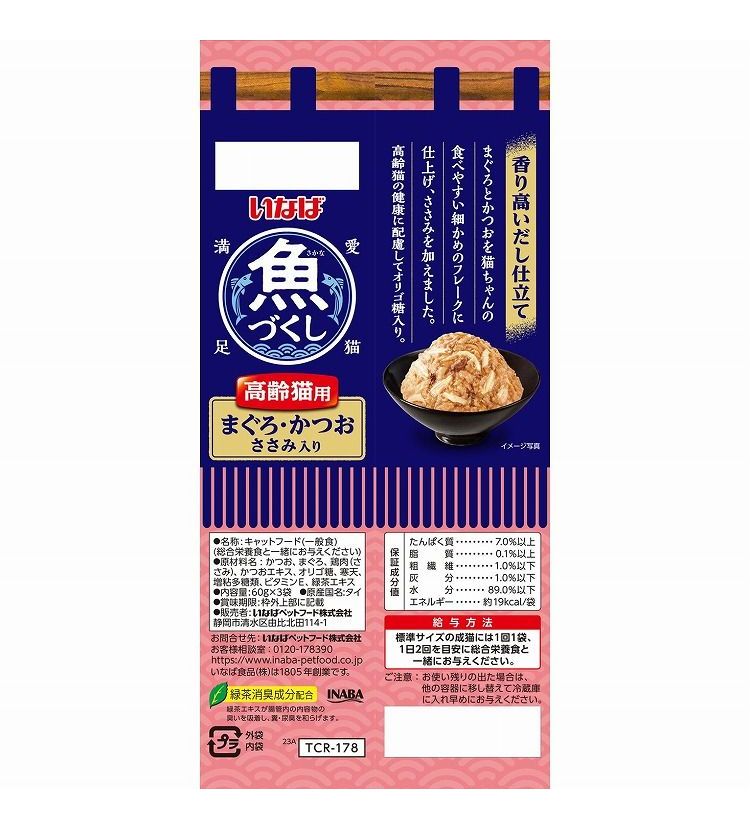 【4個セット】 いなば 魚づくし 高齢猫用 まぐろ・かつお ささみ入り 60g×3袋入 x4【ポイント10倍】