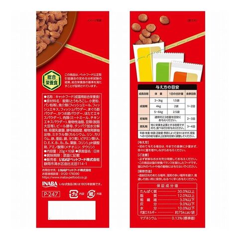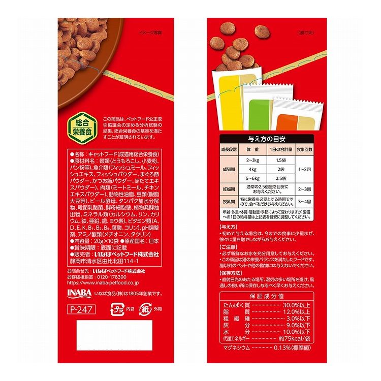 穀類(とうもろこし、小麦粉、パン粉等)、魚介類(フィッシュミール、フィッシュエキス、フィッシュパウダー、まぐろ節パウダー、かつお節パウダー、ほたてエキスパウダー)、チキンエキスパウダー、ミートミール、動物性油脂、豆類(脱脂大豆等)、ビール酵母、タンパク加水分解物、殺菌乳酸菌、酵母細胞壁、植物発酵抽出物、ミネラル類(カルシウム、リン、カリウム、鉄、亜鉛、銅、ヨウ素)、ビタミン類(A、D、E、K、B1、B2、B6、葉酸、コリン)、アミノ酸類(メチオニン、タウリン)、pH調整剤