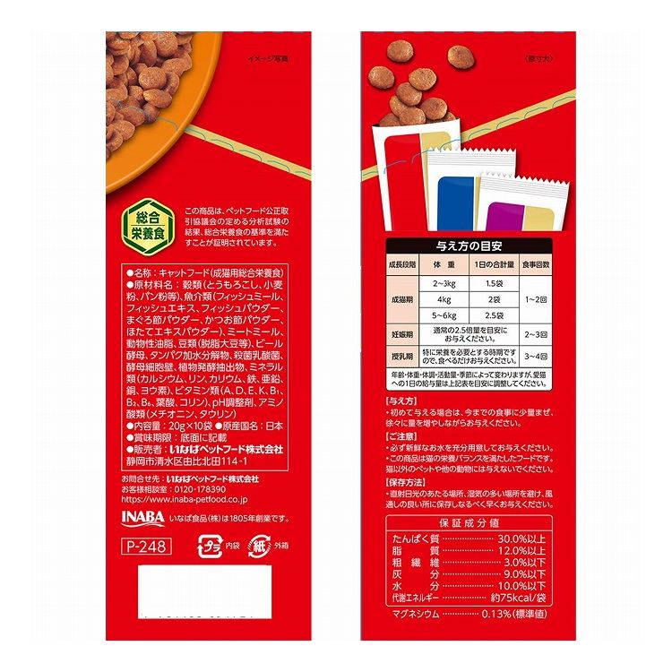 穀類(とうもろこし、小麦粉、パン粉等)、魚介類(フィッシュミール、フィッシュエキス、フィッシュパウダー、まぐろ節パウダー、かつお節パウダー、ほたてエキスパウダー)、ミートミール、動物性油脂、豆類(脱脂大豆等)、ビール酵母、タンパク加水分解物、殺菌乳酸菌、酵母細胞壁、植物発酵抽出物、ミネラル類(カルシウム、リン、カリウム、鉄、亜鉛、銅、ヨウ素)、ビタミン類(A、D、E、K、B1、B2、B6、葉酸、コリン)、アミノ酸類(メチオニン、タウリン)、pH調整剤