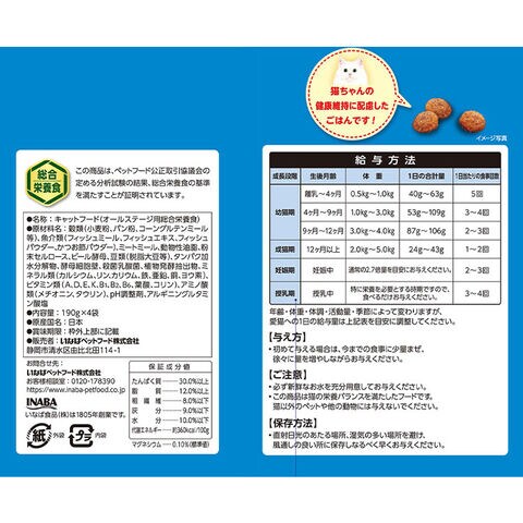 穀類(小麦粉、パン粉、コーングルテンミール等)、魚介類(フィッシュミール、フィッシュエキス、フィッシュパウダー、かつお節パウダー)、ミートミール、動物性油脂、粉末セルロース、ビール酵母、豆類(脱脂大豆等)、タンパク加水分解物、酵母細胞壁、殺菌乳酸菌、植物発酵抽出物、ミネラル類(カルシウム、リン、カリウム、鉄、亜鉛、銅、ヨウ素)、ビタミン類(A、D、E、K、B1、B2、B6、葉酸、コリン)、アミノ酸類(メチオニン、タウリン)、pH調整剤、アルギニングルタミン酸塩