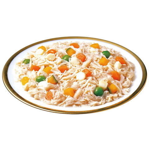 鶏肉(ささみ)、野菜(人参、かぼちゃ、グリンピース)、チーズ、大豆油、でん粉、寒天、ミネラル類(Ca、Fe、Cu、Mn、Zn、I、K、Mg、Se)、増粘多糖類、ビタミン類(A、D3、E、B1、B2、B6、葉酸、B12、コリン、ビオチン)、紅麹色素、緑茶エキス