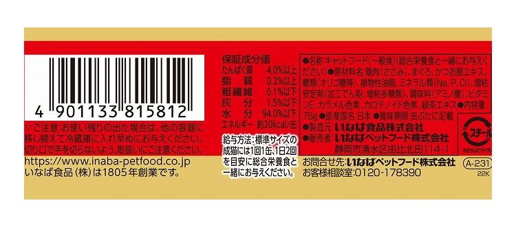 鶏肉(ささみ)、まぐろ、かつお節エキス、糖類(オリゴ糖等)、植物性油脂、ミネラル類(Na、P、Cl)、増粘安定剤(加工でん粉、増粘多糖類)、調味料(アミノ酸)、ビタミンE、カラメル色素、カロテノイド色素、緑茶エキス