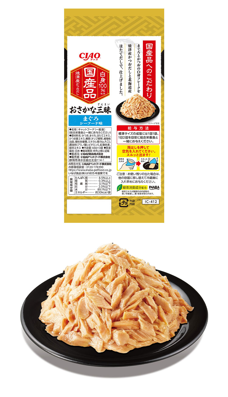 かつお、まぐろ、ほたてエキス、かつお節エキス、糖類(オリゴ糖等)、植物性油脂、増粘多糖類、ミネラル類(Na、P、Cl)、調味料(アミノ酸)、ビタミンE、紅麹色素、緑茶エキス