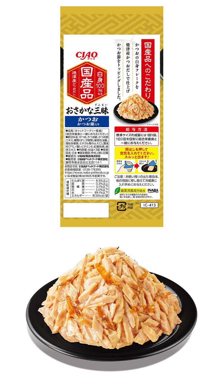 かつお、かつお節、かつお節エキス、糖類(オリゴ糖等)、植物性油脂、増粘多糖類、ミネラル類(Na、P、Cl)、調味料(アミノ酸)、ビタミンE、紅麹色素、緑茶エキス