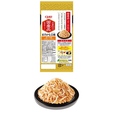 かつお、ささみ、しらす、かつお節エキス、糖類(オリゴ糖等)、植物性油脂、増粘多糖類、ミネラル類(Na、P、Cl)、調味料(アミノ酸)、ビタミンE、紅麹色素、緑茶エキス