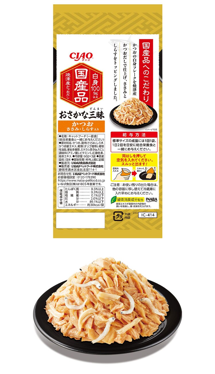 かつお、ささみ、しらす、かつお節エキス、糖類(オリゴ糖等)、植物性油脂、増粘多糖類、ミネラル類(Na、P、Cl)、調味料(アミノ酸)、ビタミンE、紅麹色素、緑茶エキス