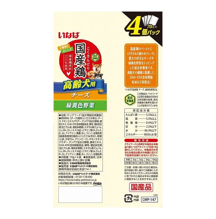 ・高齢犬の健康に配慮して、DHA・EPA含有精製魚油を2倍配合(*いなば「国産鶏 チーズ緑黄色野菜」比)