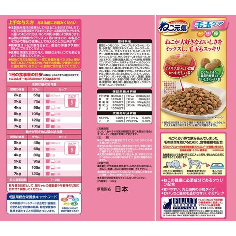 穀類(トウモロコシ、コーングルテンミール、パン粉、小麦粉)、肉類(チキンミール、ポークミール、ビーフミール、チキンエキス)、セルロースパウダー、動物性油脂、魚介類(フィッシュエキス、フィッシュミール、サバパウダー、まぐろミール、かつおエキス)、豆類(脱脂大豆)、ビール酵母、野菜類(ニンジンパウダー、カボチャパウダー、ホウレンソウパウダー)、酵母エキス、ミネラル類(カルシウム、塩素、コバルト、銅、鉄、ヨウ素、カリウム、マンガン、リン、亜鉛)、アミノ酸類(タウリン、メチオニン)、ビタミン類(A、B1、B2、B6、B12、C、D、E、K、コリン、ナイアシン、パントテン酸、ビオチン、葉酸)、着色料(二酸化チタン、赤色102号、赤色106号、黄色4号、黄色5号、青色1号)、酸化防止剤(ミックストコフェロール、ハーブエキス)