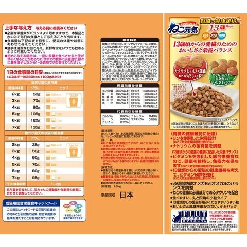 穀類(トウモロコシ、コーングルテンミール、小麦粉、パン粉)、肉類(ポークミール、ビーフミール、チキンミール、チキンエキス)、動物性油脂、魚介類(フィッシュミール、フィッシュエキス、サバパウダー、まぐろミール、かつおミール、白身魚ミール、かつおエキス)、野菜類(ビートパルプ)、ビール酵母、セルロースパウダー、酵母エキス、ミネラル類(カルシウム、塩素、コバルト、銅、鉄、ヨウ素、カリウム、マンガン、リン、亜鉛)、アミノ酸類(タウリン、メチオニン)、ビタミン類(A、B1、B2、B6、B12、C、D、E、K、コリン、ナイアシン、パントテン酸、ビオチン、葉酸)、着色料(二酸化チタン、赤色102号、赤色106号、黄色4号、黄色5号)、酸化防止剤(ミックストコフェロール、ハーブエキス)