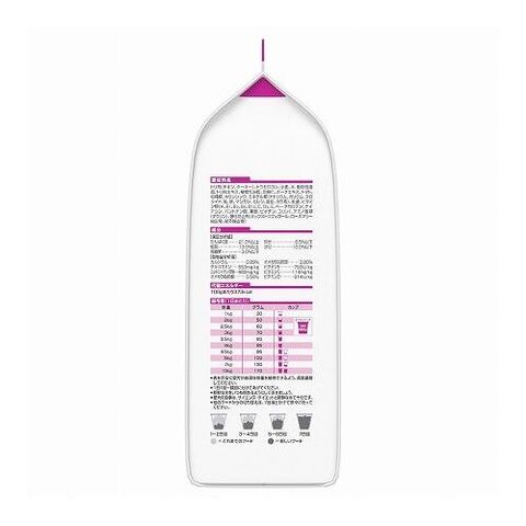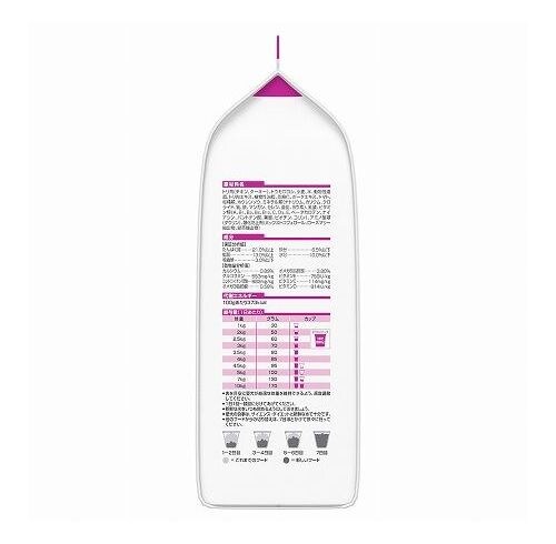 トリ肉(チキン、ターキー)、トウモロコシ、小麦、米、動物性油脂、トリ肉エキス、植物性油脂、亜麻仁、ポークエキス、トマト、柑橘類、ホウレンソウ、ミネラル類(ナトリウム、カリウム、クロライド、銅、鉄、マンガン、セレン、亜鉛、ヨウ素)、乳酸、ビタミン類(A、B1、B2、B6、B12、C、D3、E、ベータカロテン、ナイアシン、パントテン酸、葉酸、ビオチン、コリン)、アミノ酸類(タウリン)