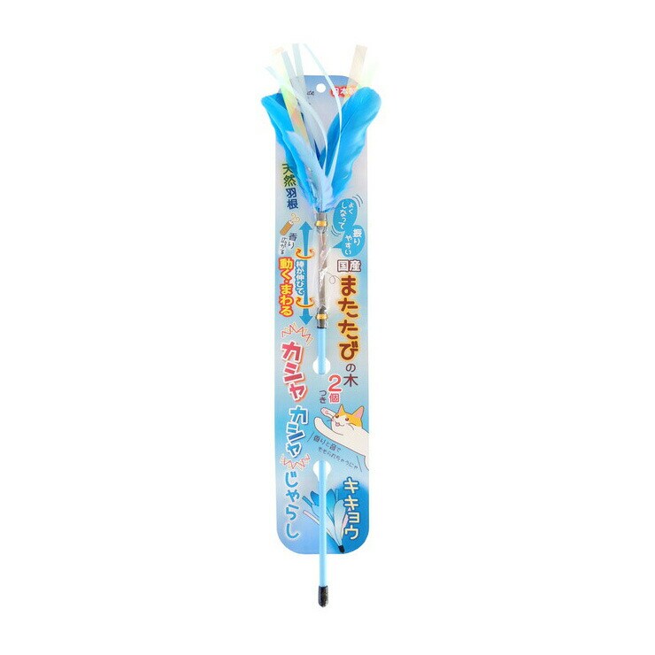 ・ネコちゃんが好きなまたたびの木を使用しています・またたびに反応すると転げ回ったり体をこすりつけたり、特有の陶酔状態になりますが、しばらくすると通常の状態に戻ります。特有の陶酔状態時の事故を防ぐため、倒れやすいものや階段の近くでは与えないでください。※またたびの効果・反応には個体差があります。・ネコちゃんが好きなカシャカシャフィルムを使用しています・狩猟本能が刺激されて興奮します。猫の噛み方や噛む力によって破損することがあります。本品が傷みはじめたら使用を中止してください。(注意)飼い主が遊ばせる玩具ですので絶対に猫だけで遊ばせないでください。口に入れる玩具ではありません。猫が口に入れたときは、必ず止めさせてください。使用後は必ず幼児や子供、猫が触れない場所に保管してください。万一、人やペットが部品を誤飲した時はすぐに医師に相談してください。・ネコちゃんが好きな天然の羽根を使用しています・狩猟本能が刺激されて興奮し、おもちゃを噛んで壊そうとします。天然の羽根は壊れやすいので、先端のおもちゃ部分を完全に捕まえた時は、一旦取りあげてから再び遊ばせてください。※天然素材のため、形・サイズが異なります。ご了承ください。