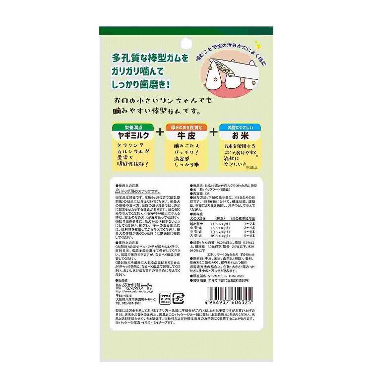 多孔質な棒型ガムをガリガリ噛んでしっかり歯みがき!栄養満点なヤギミルクと厚みのある良質な牛皮をお腹にやさしいお米でしっかり固めました。