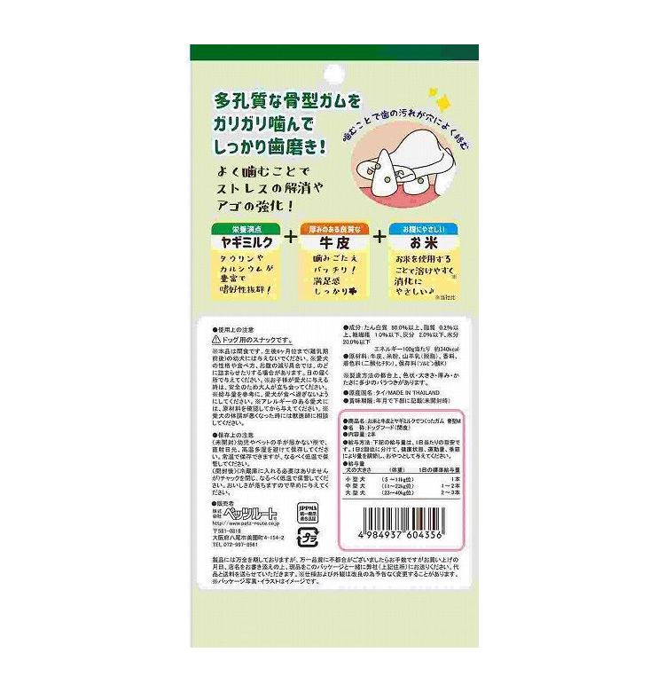 牛皮、米粉、山羊乳(脱脂)、香料、着色料(二酸化チタン)、保存料(ソルビン酸K)