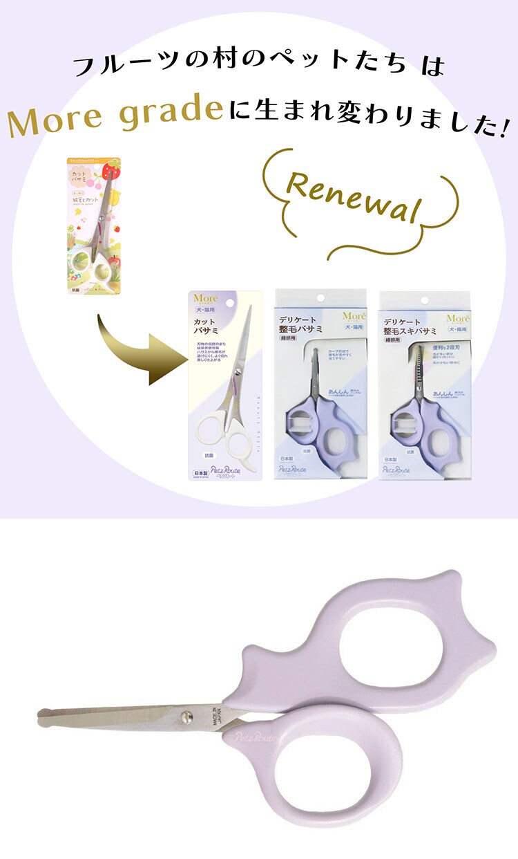 スッと!切れる薄刃仕上、毛束に入りやすく、なめらかな切れ心地で毛への負担を軽減、被毛を痛めにくくなっています。ペットにやさしいハサミです。先丸で顔周りも安心、カーブ形状で当てやすい設計になっています。刃物の伝統の町岐阜県関市製。