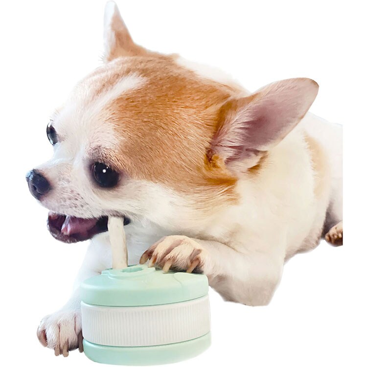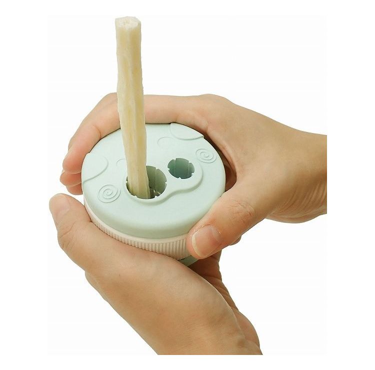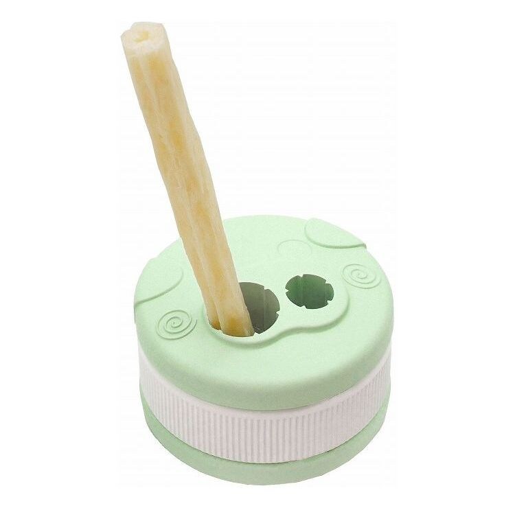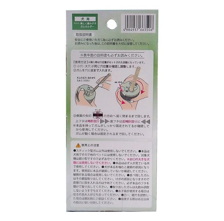 ・デンタルガムを穴に入れ上下フタを回すだけでしっかり固定、本品を愛犬が手で押さえガムをゆっくり長く噛みやすくなります。