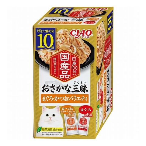 ・まぐろ×5袋、かつお・ささみ、しらす入り×5袋の計10袋入り。グルメな猫ちゃんも大満足の美味しさです。