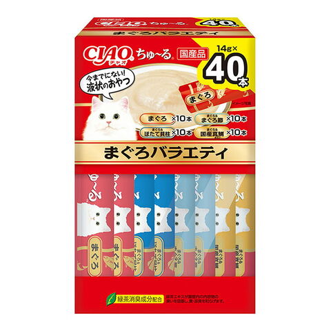 ・まぐろ、まぐろ&まぐろ節、まぐろ&ほたて貝柱、まぐろ&国産真鯛の4種フレーバー×各10本の40本入りバラエティパック。多頭飼の方にも便利な大容量です。