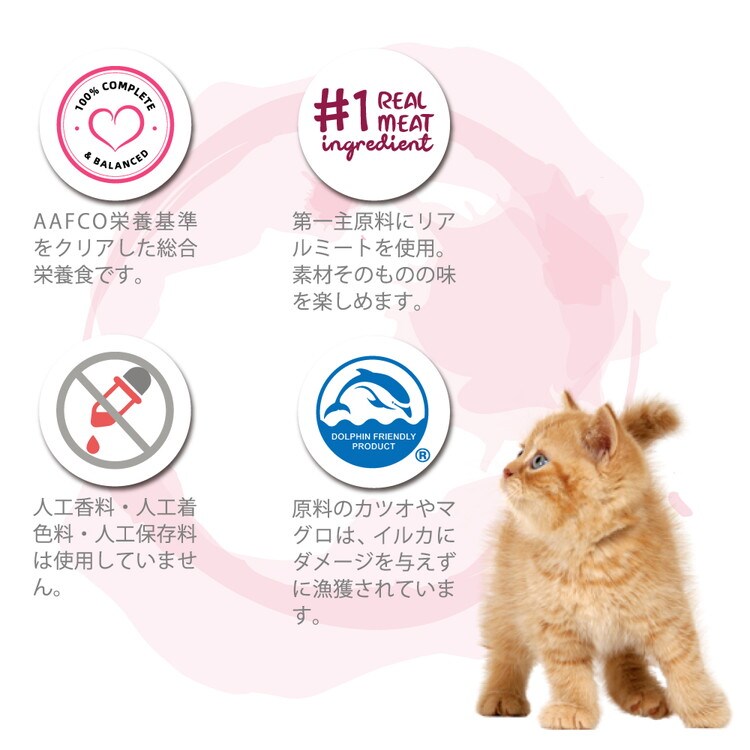 ・リアルミートを第一主原料とし、AAFCO基準をクリアした人工着色料、香料、防腐剤不使用のおしいレシピ