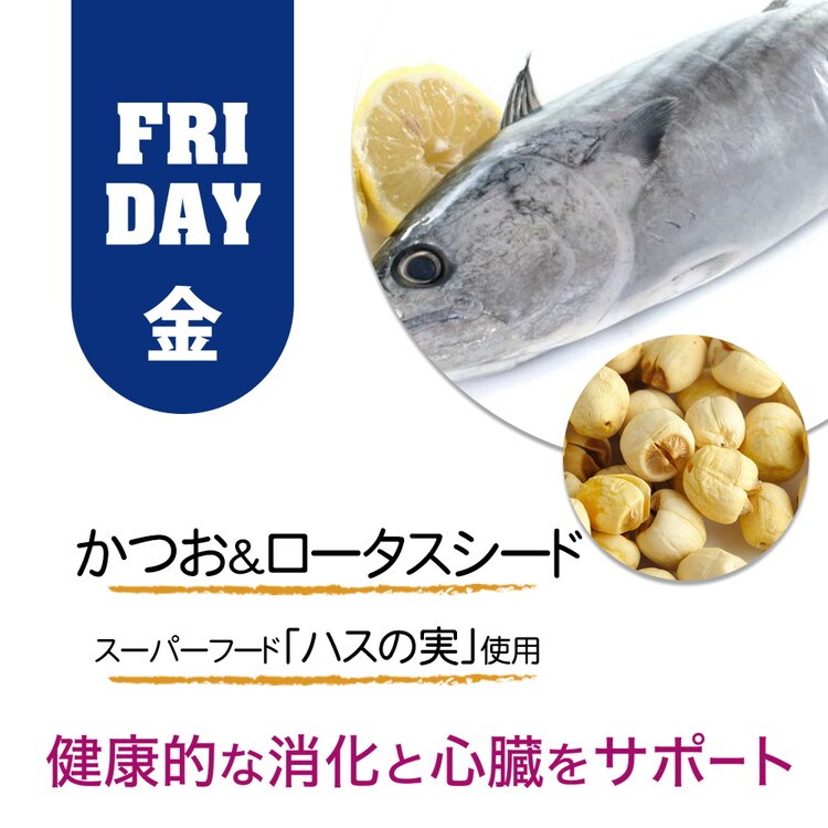 チキン、かつお、ハスの実、ビタミンとミネラル(第三リン酸カルシウム、塩化カリウム、塩化ナトリウム、塩化コリン、硫酸マグネシウム、硫酸第一鉄、酸化亜鉛、α-トコフェロール、ニコチン酸、酢酸レチノール、たんぱく質キレート銅、硫酸マンガン、チアミン硝酸塩、第二リン酸カルシウム、パントテン酸カルシウム、リボフラビン、ピリドキシン塩酸塩、ビオチン、ビタミンB12、亜セレン酸ナトリウム、コレカルシフェロール、葉酸、ヨウ化カリウム、酸化マグネシウム)、チキンレバー、グリシン、グアーガム、カラメル、まぐろエキス、タウリン