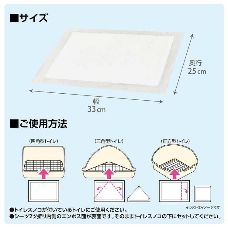 ・シーツ2つ折り内側のエンボス面が表面です。そのままトイレスノコの下にセットしてください。