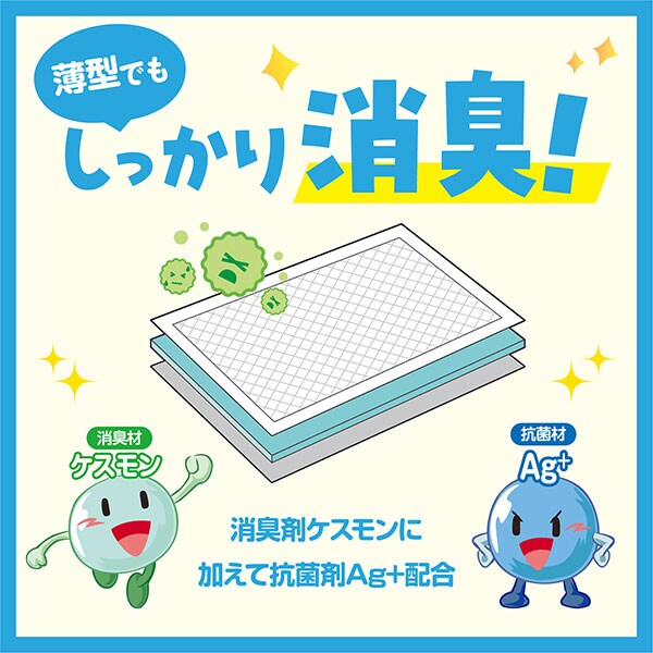 従来の厚型タイプと同じ消臭材ケスモン、抗菌材Ag+を配合
